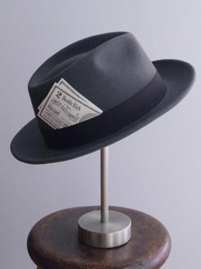 リボンは 30mm のグログランリボン。リボン端にカギ爪プレートがつけられたドレスハット仕様。右後部に 2 ドルを模した紙幣カタログフラッシャーが挟み込まれたデザインが特徴です。
