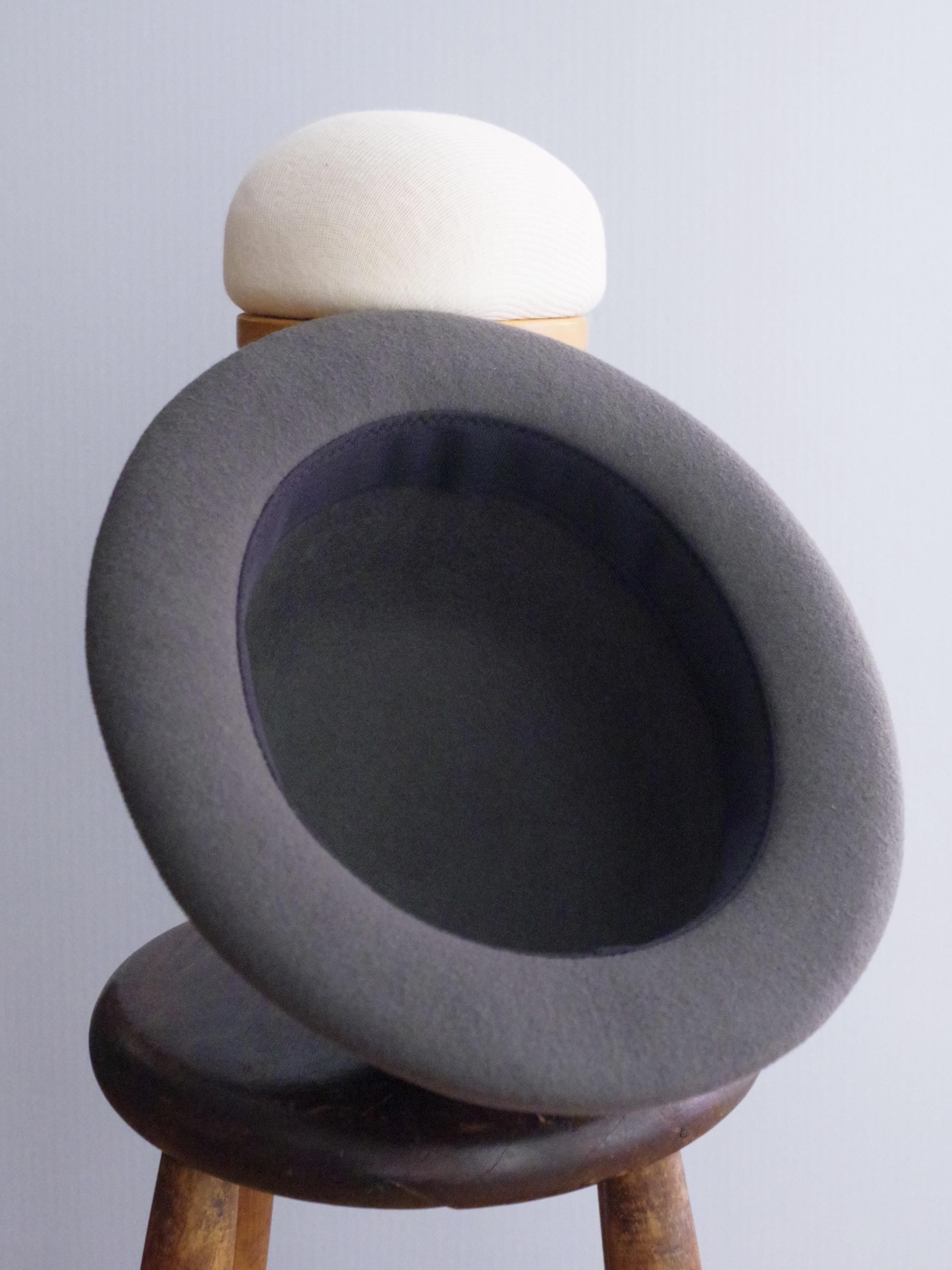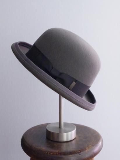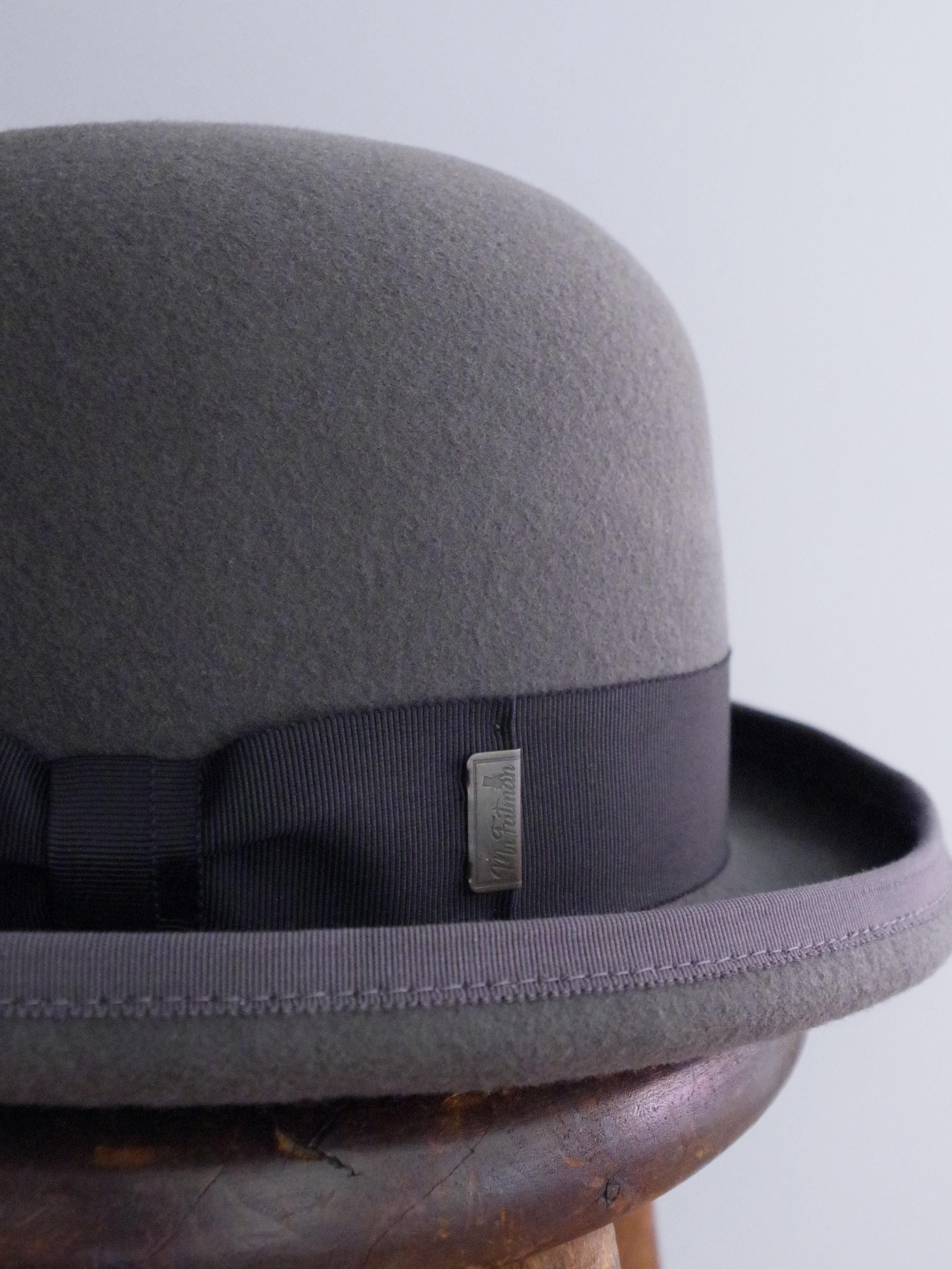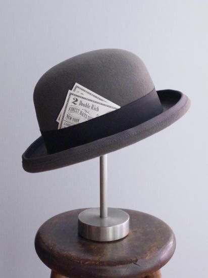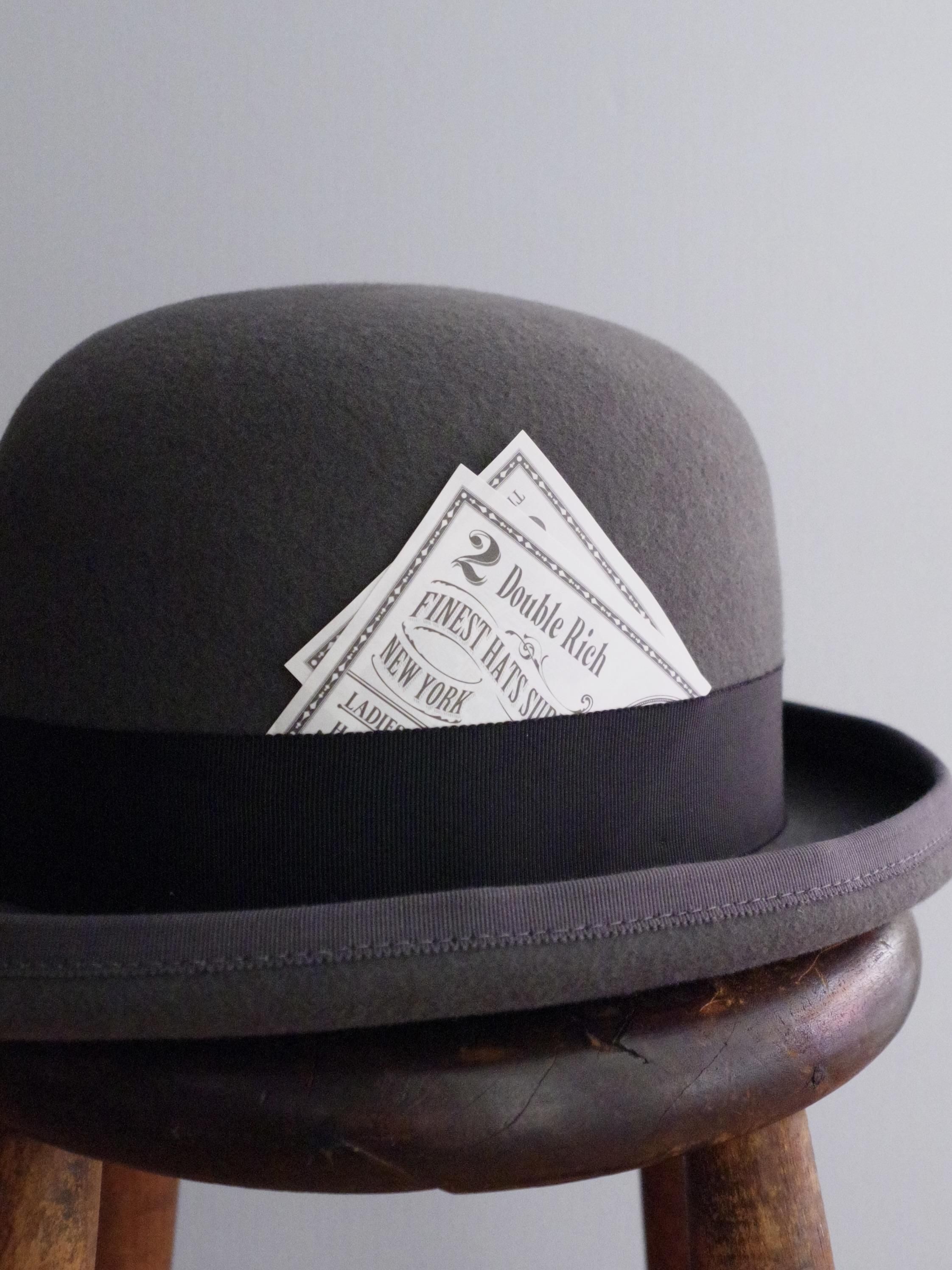 リボンは 38mm のグログランリボンで、リボン端にカギ爪プレートがつけられたドレスハット仕様。 ブリムは弓形型のペンシルカールの25mm パイピング仕立て。右後部に 2 ドルを模した紙幣カタログフラッシャーが挟み込まれたデザインが特徴です。