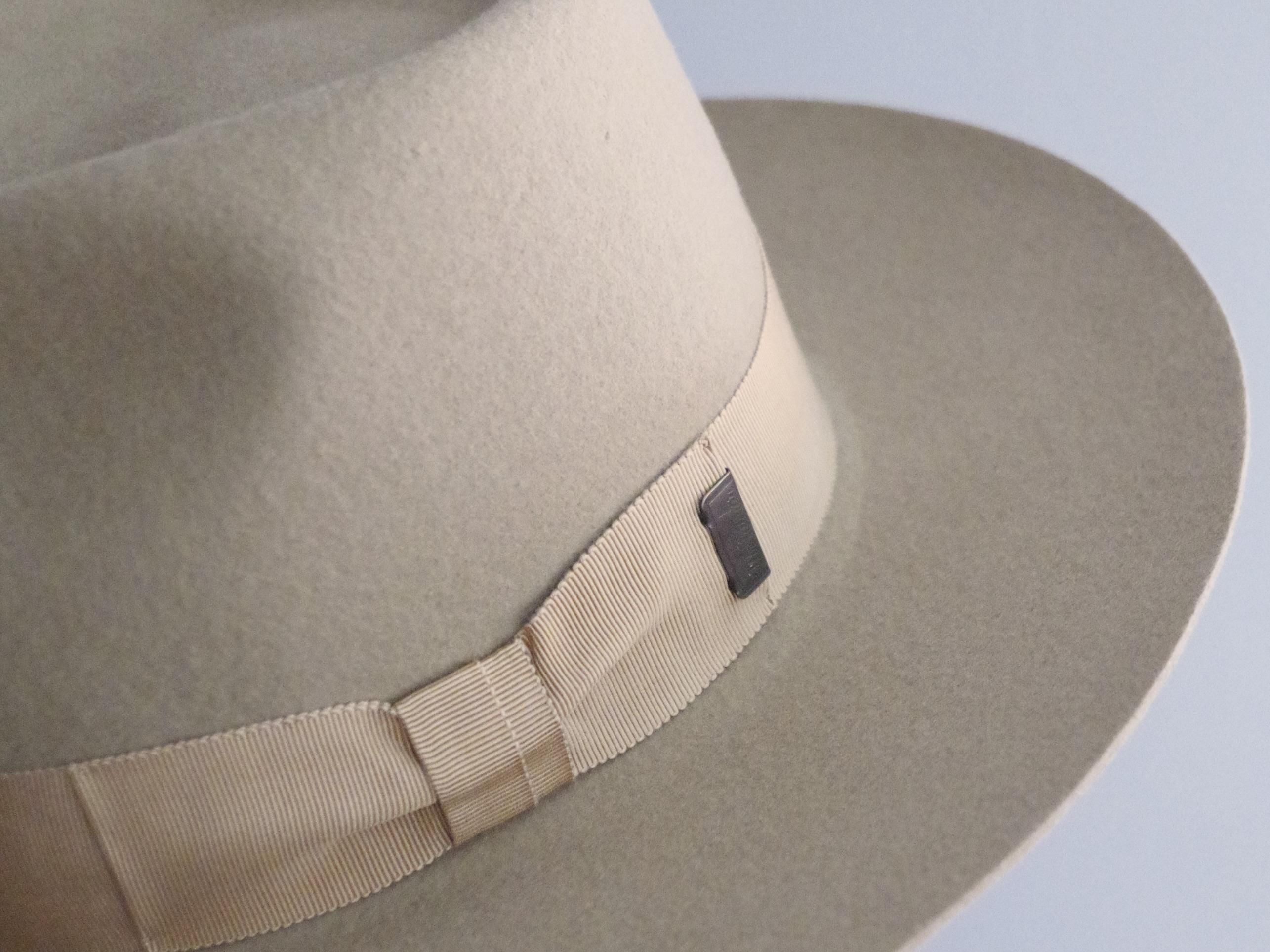 リボンは 38mm、リボン端にカギ爪プレートがつけられたドレスハット仕様。 ブリムはフラットに近いフラットアップの 7.3cm~7.8cm 幅。右後部に 2 ドルを模した紙幣カタログフラッシャーが挟み込まれたデザインが特徴です。