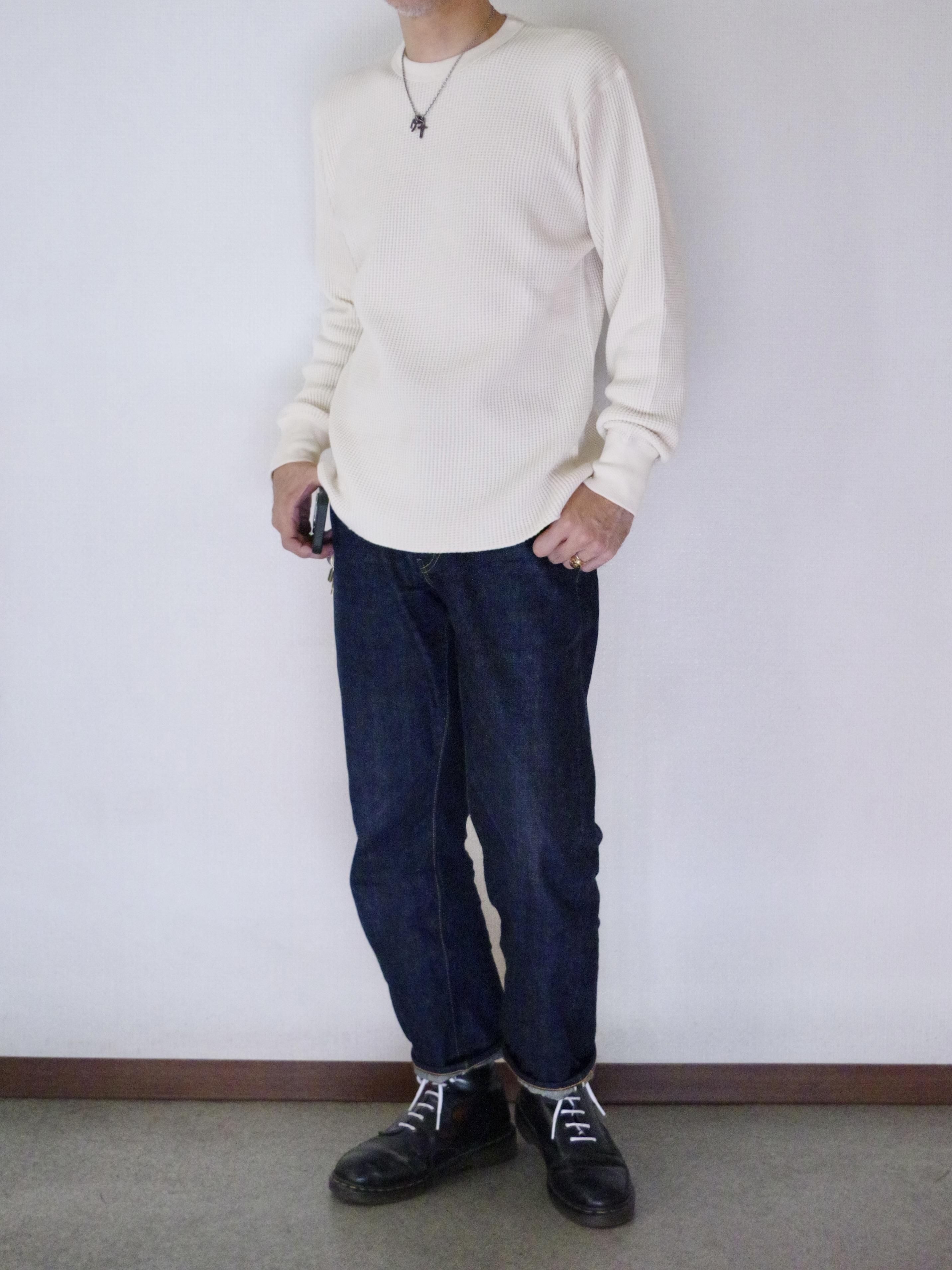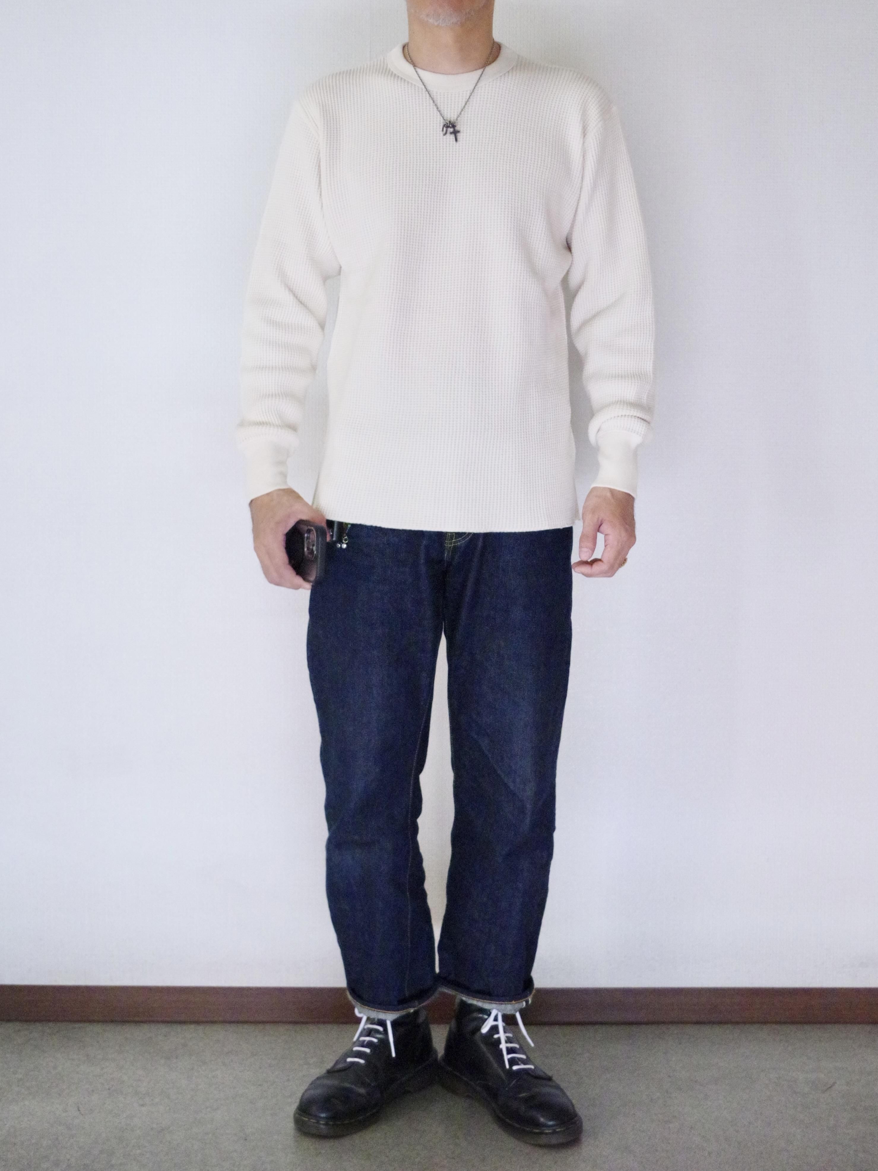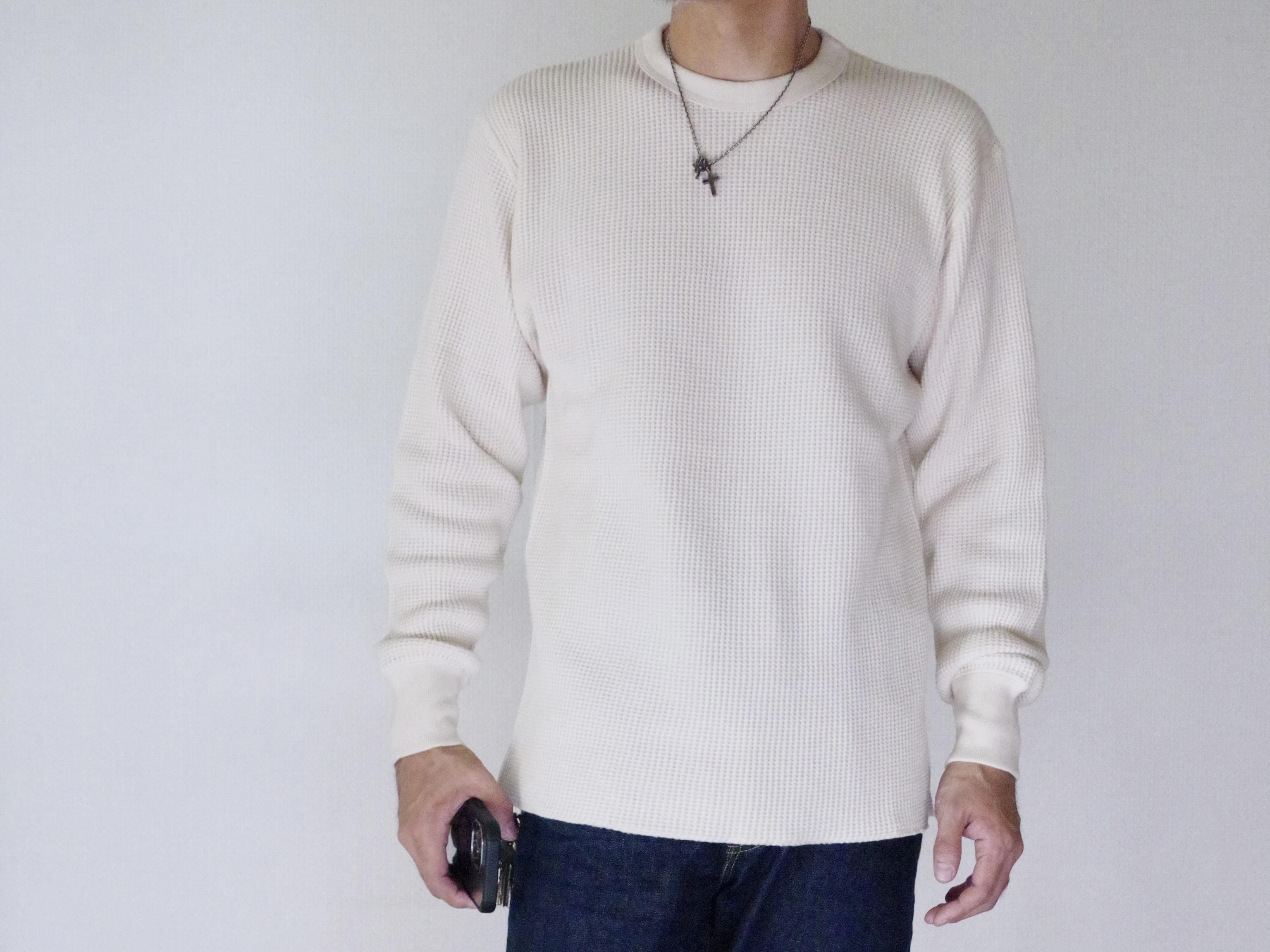 3本針による縫製、締め付けの強いしっかりとしたリブなど、着心地の良さとオールド感のあるMEGAサーマルはインナーとしても、一枚での着用も、スタイルが決まる万能な一着になりました。